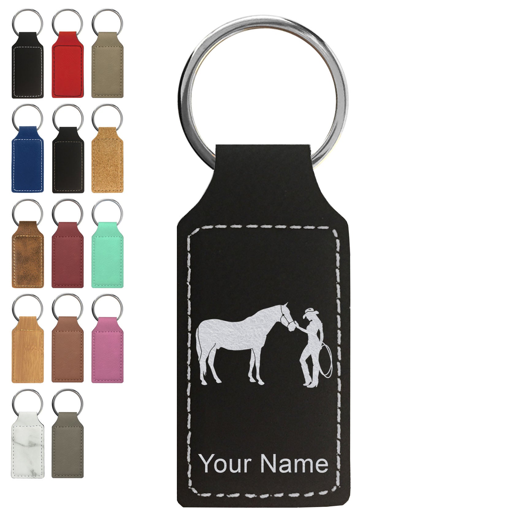 Faux Leather Rectangle Keychain, Horse and Cowgirl, Personalized Engraving Included