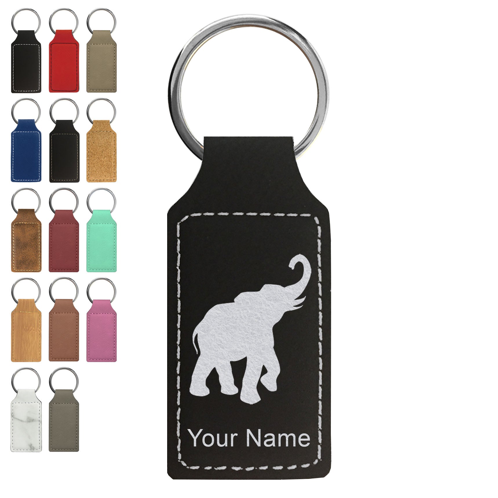 Faux Leather Rectangle Keychain, Indian Elephant, Personalized Engraving Included