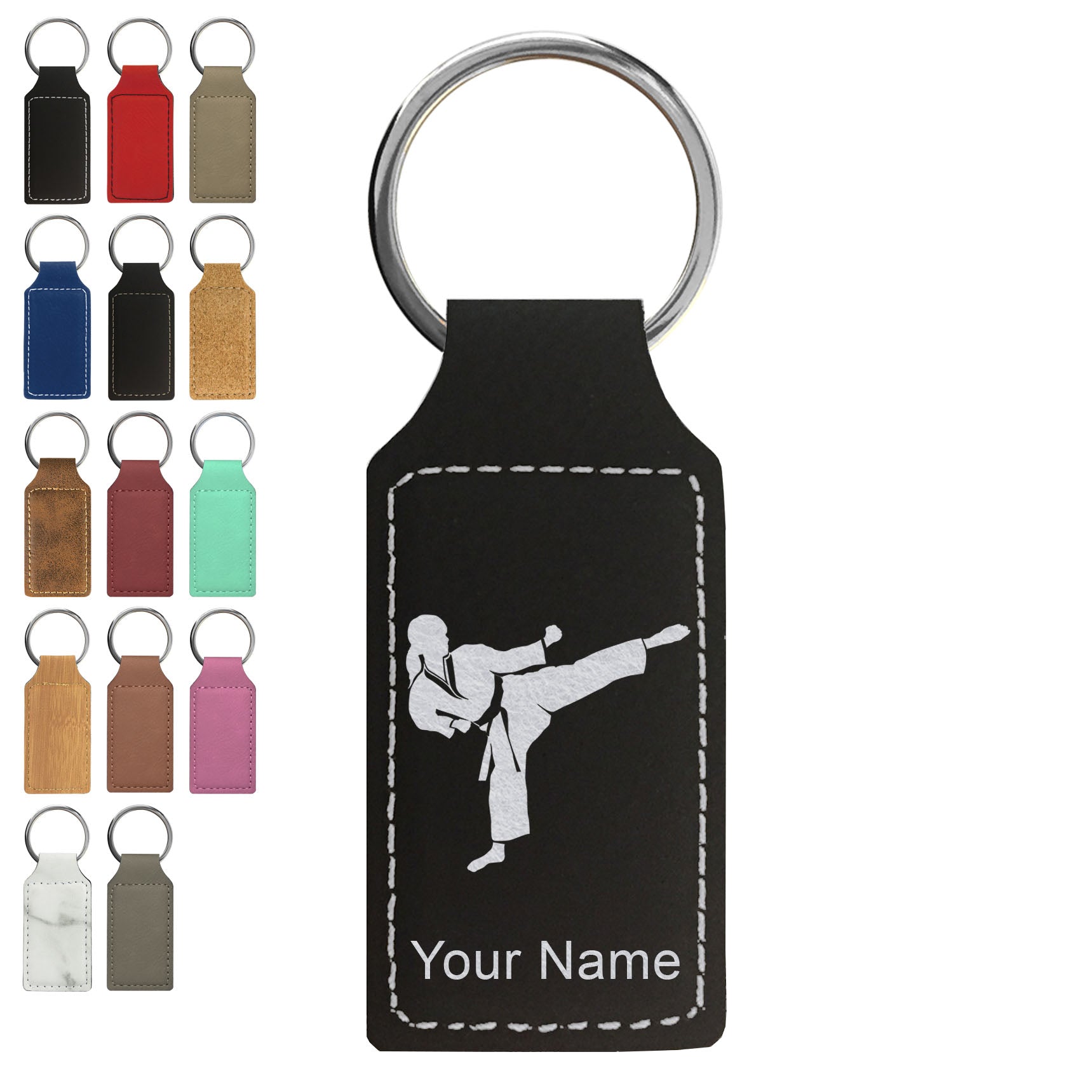 Faux Leather Rectangle Keychain, Karate Woman, Personalized Engraving Included