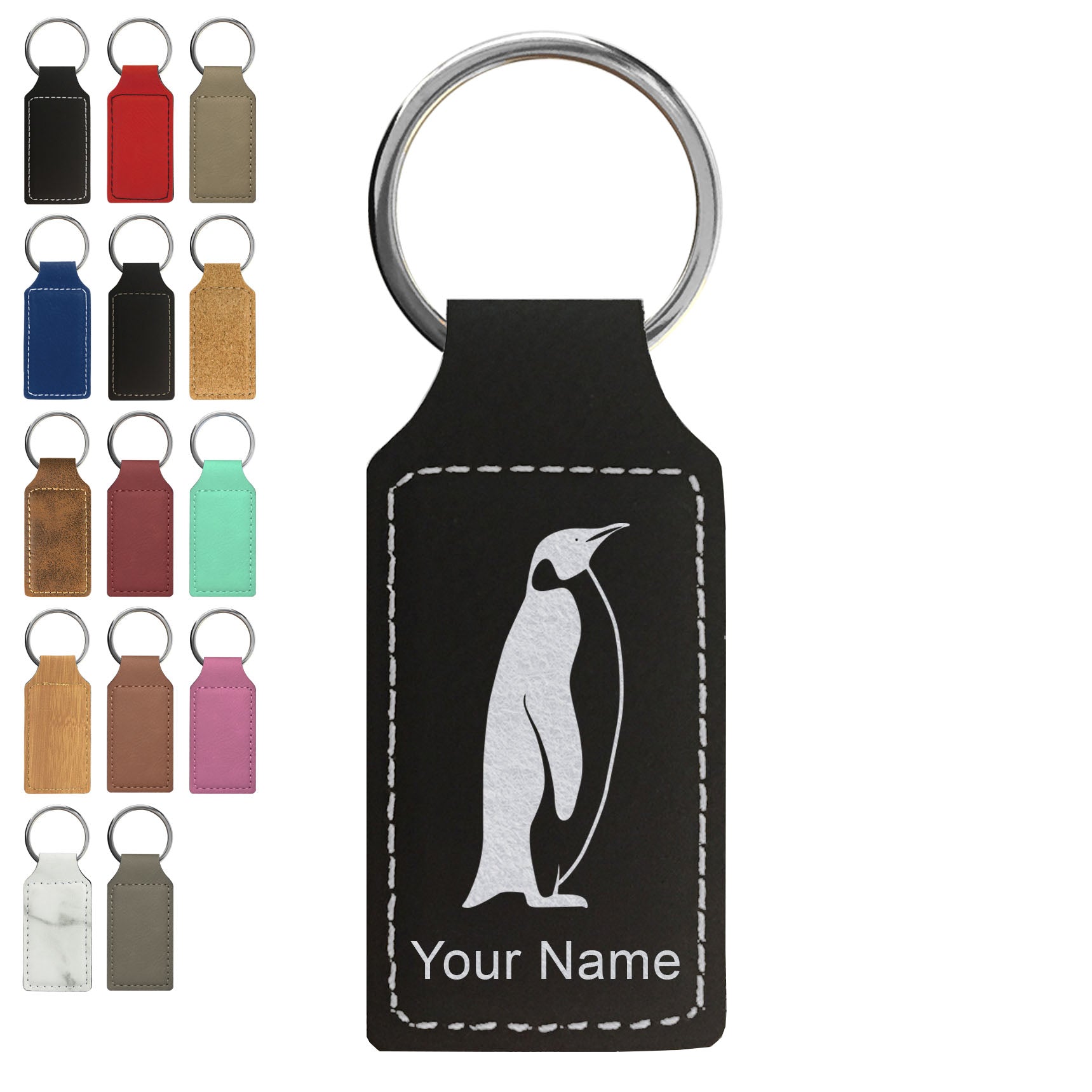 Faux Leather Rectangle Keychain, Penguin, Personalized Engraving Included