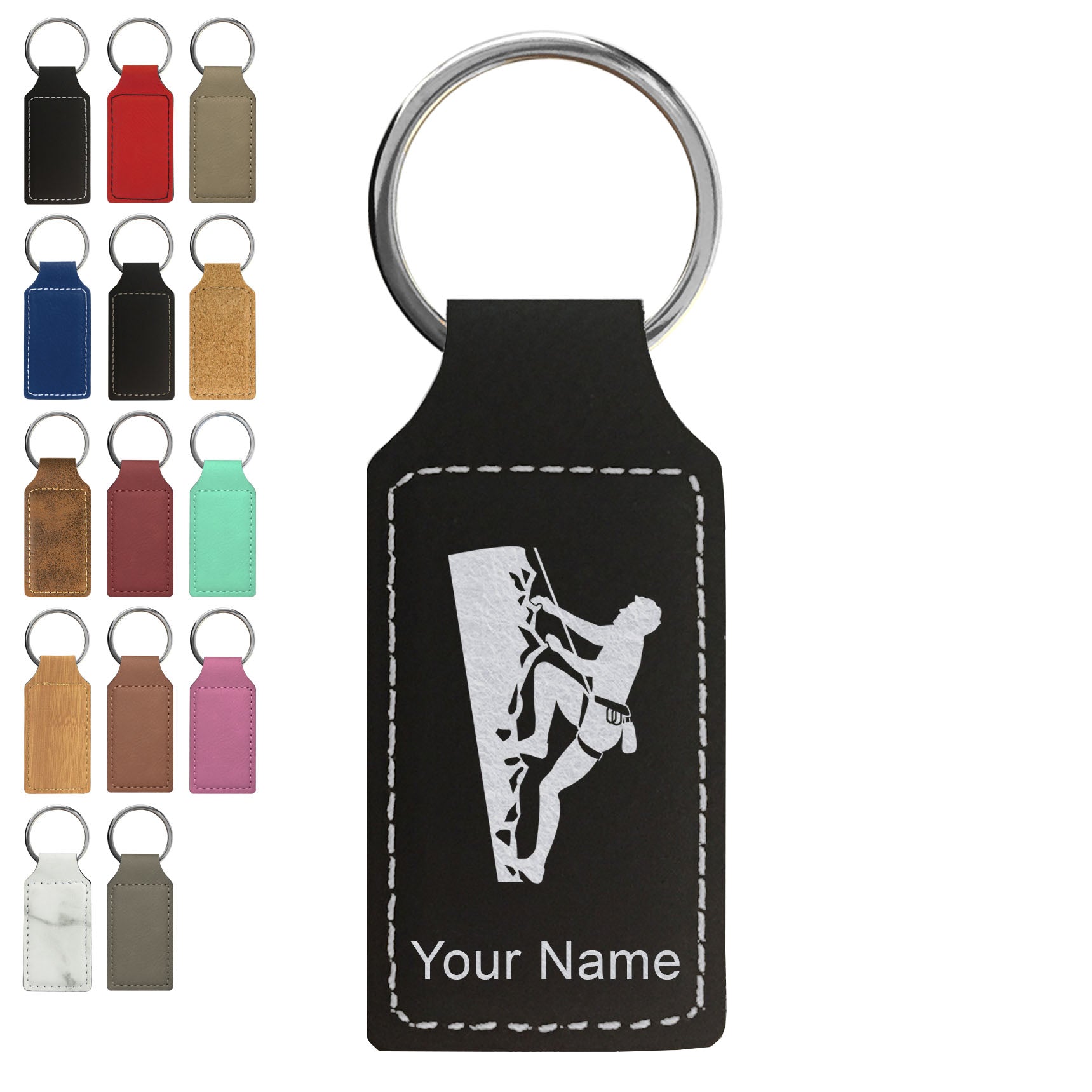 Faux Leather Rectangle Keychain, Rock Climber, Personalized Engraving Included