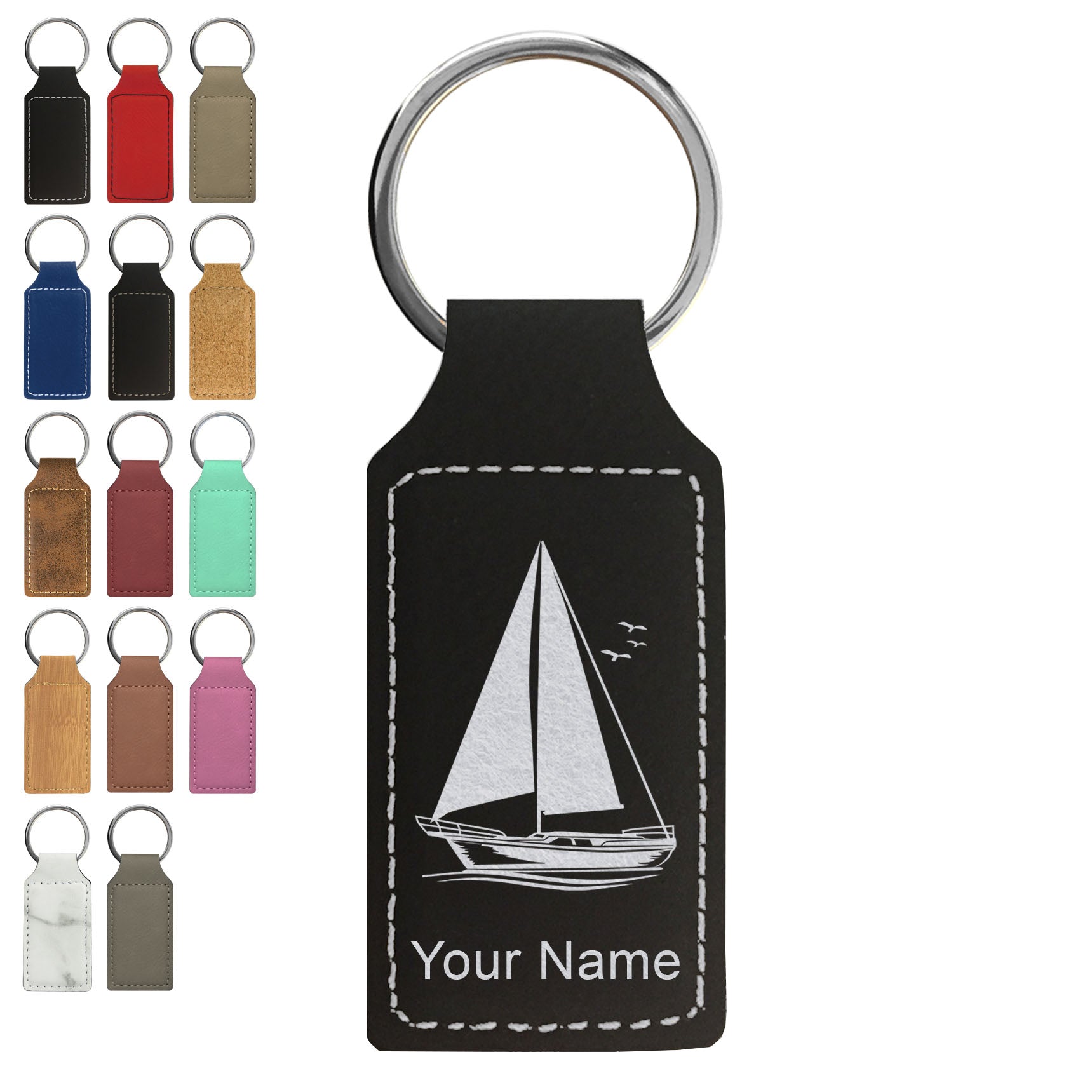 Faux Leather Rectangle Keychain, Sailboat, Personalized Engraving Included