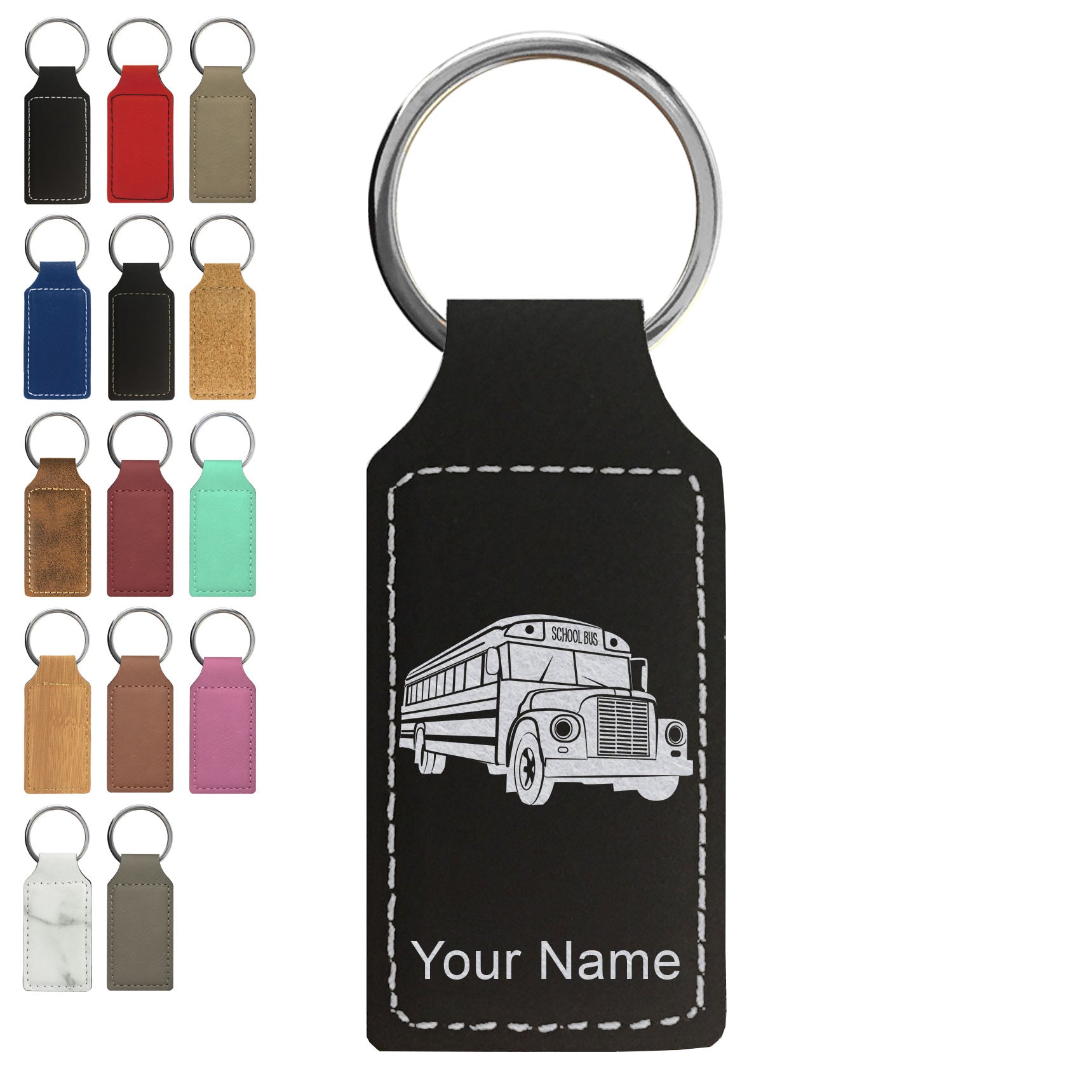 Faux Leather Rectangle Keychain, School Bus, Personalized Engraving Included