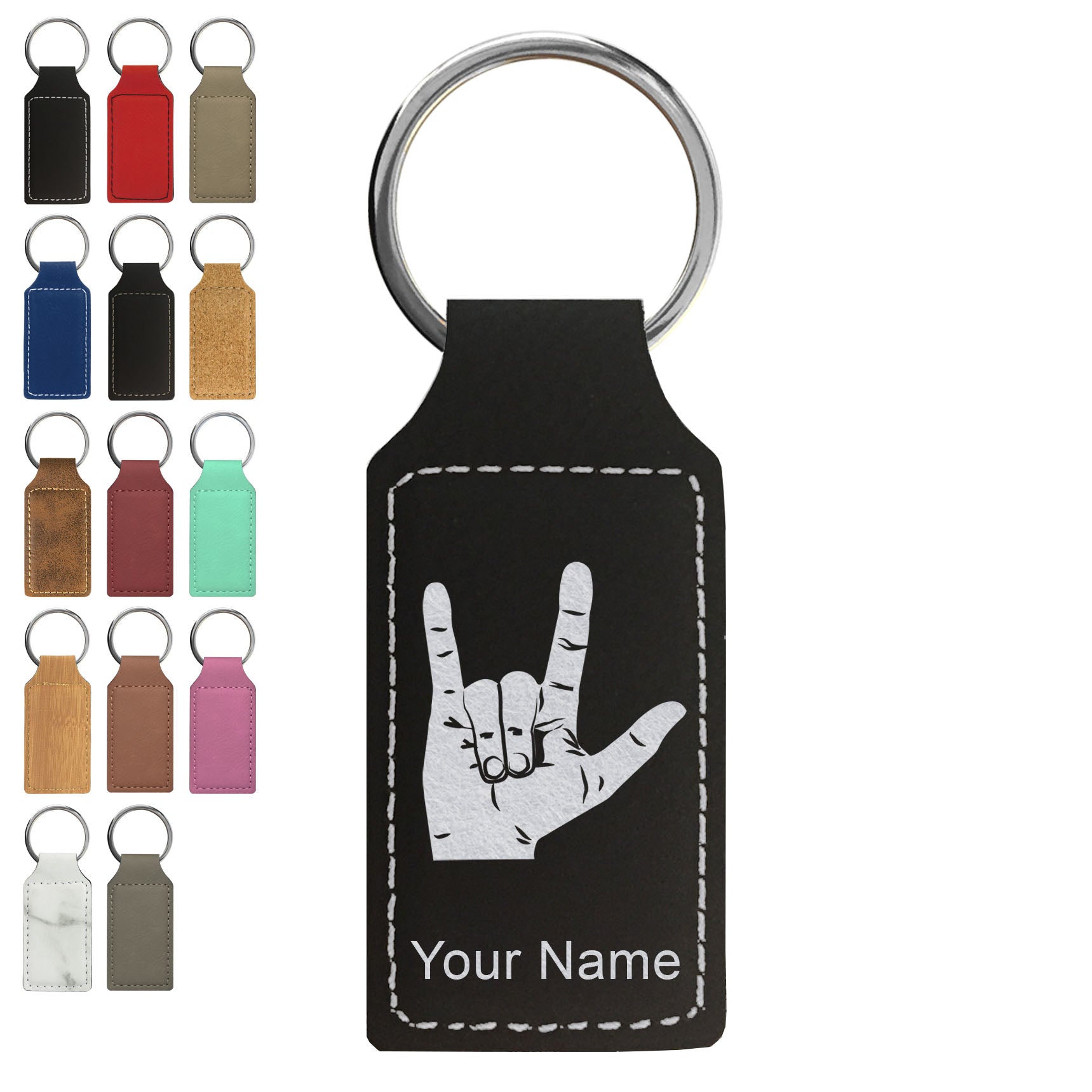 Faux Leather Rectangle Keychain, Sign Language I Love You, Personalized Engraving Included