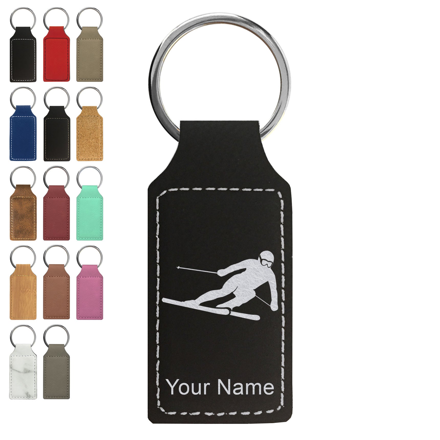 Faux Leather Rectangle Keychain, Skier Downhill, Personalized Engraving Included