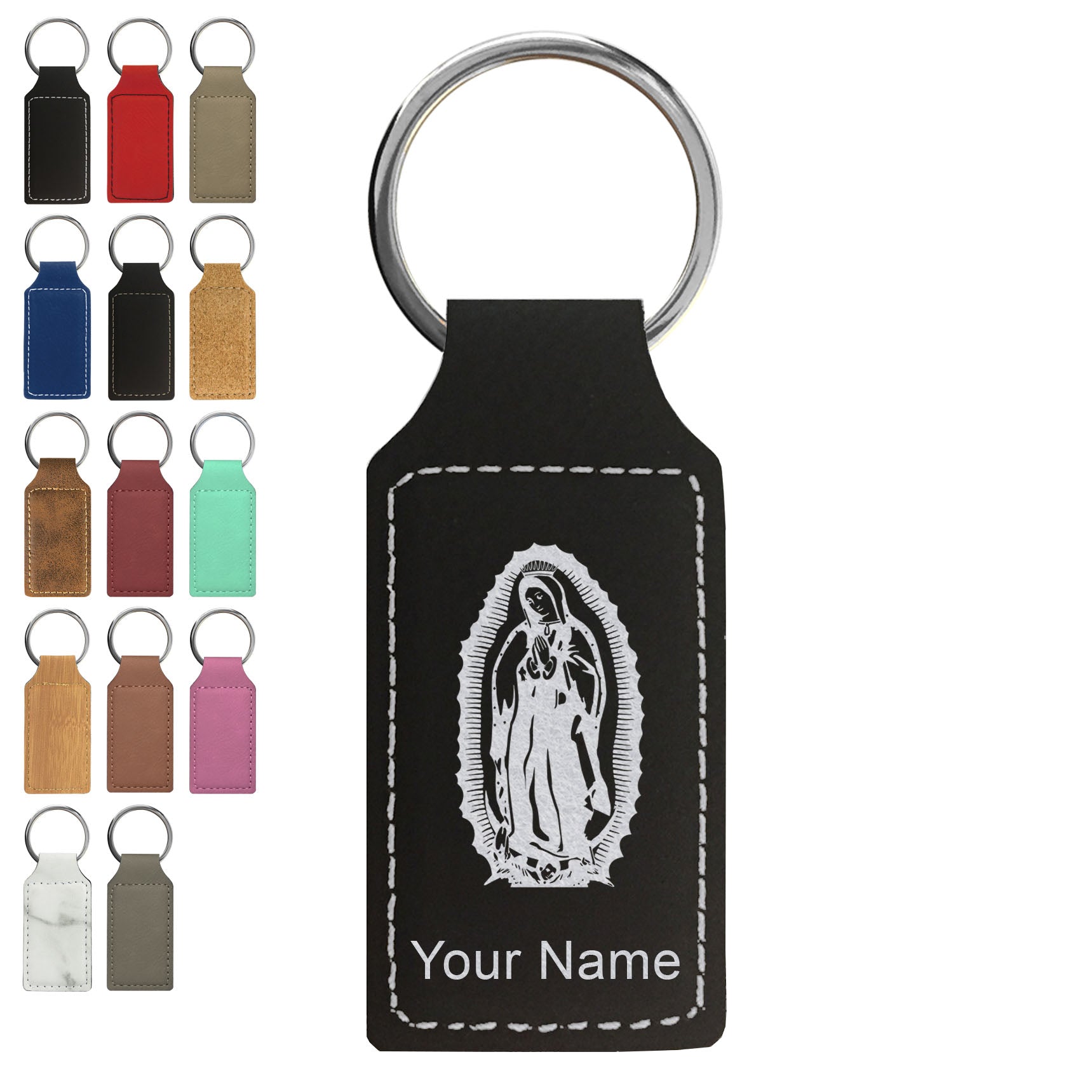 Faux Leather Rectangle Keychain, Virgen de Guadalupe, Personalized Engraving Included