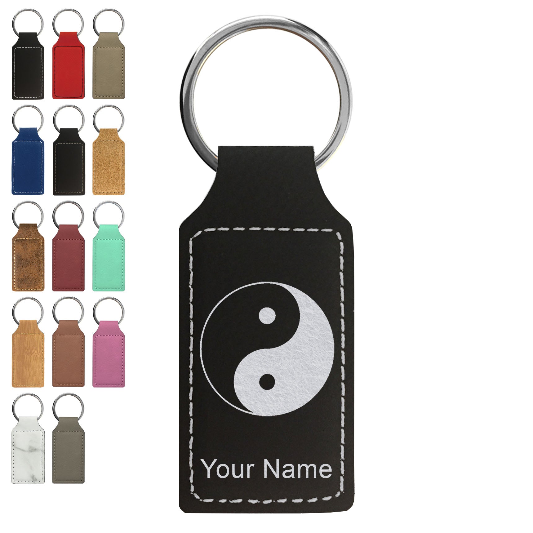 Faux Leather Rectangle Keychain, Yin Yang, Personalized Engraving Included