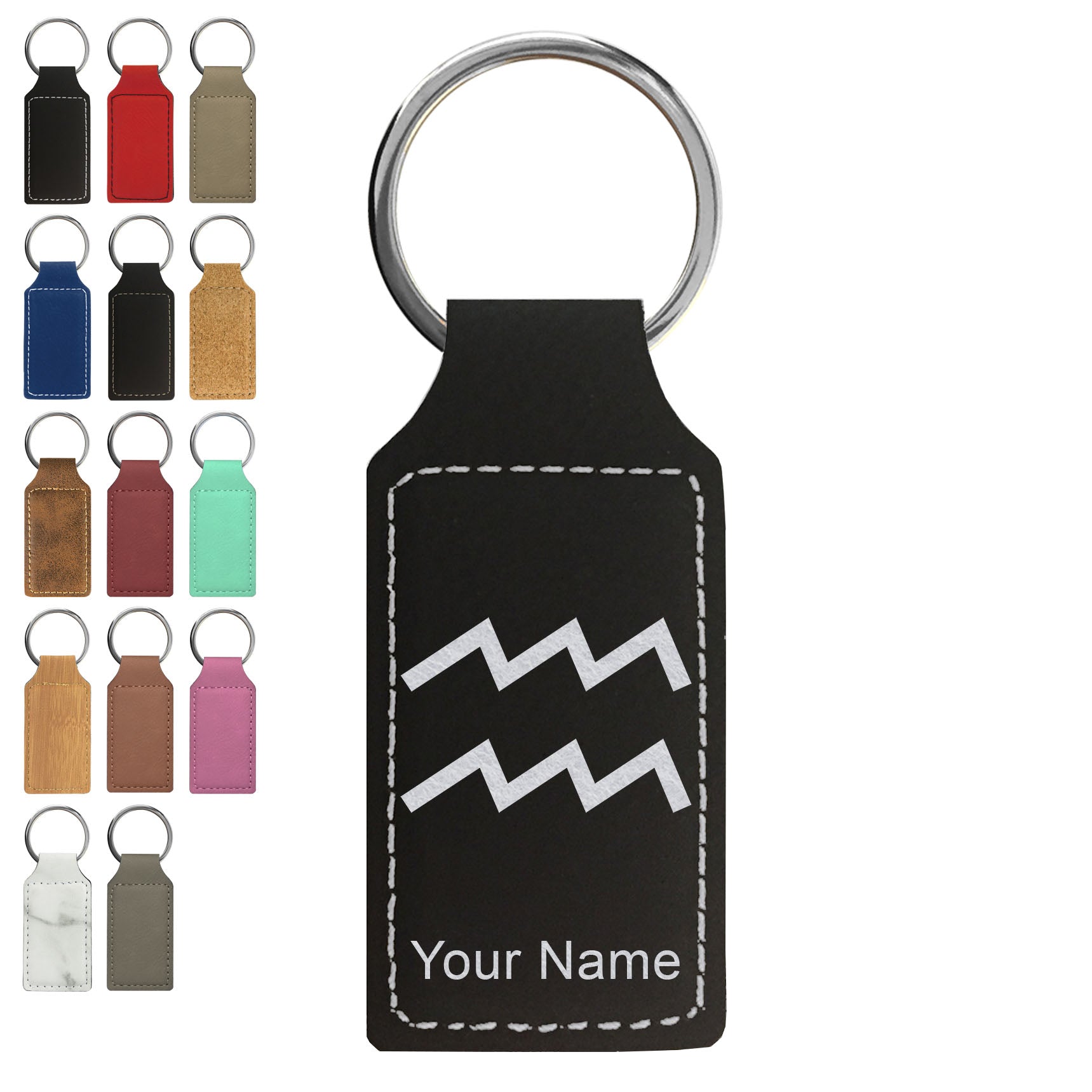Faux Leather Rectangle Keychain, Zodiac Sign Aquarius, Personalized Engraving Included