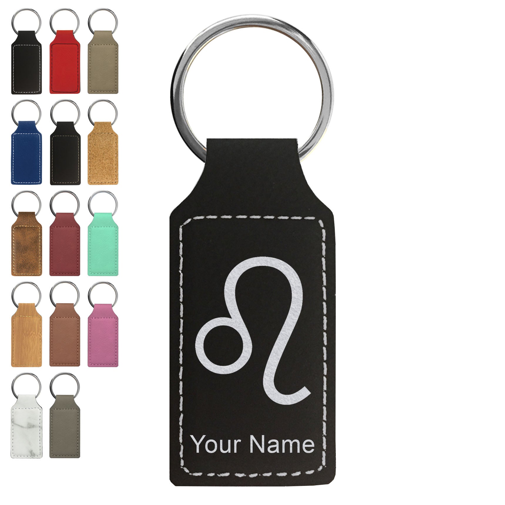 Faux Leather Rectangle Keychain, Zodiac Sign Leo, Personalized Engraving Included