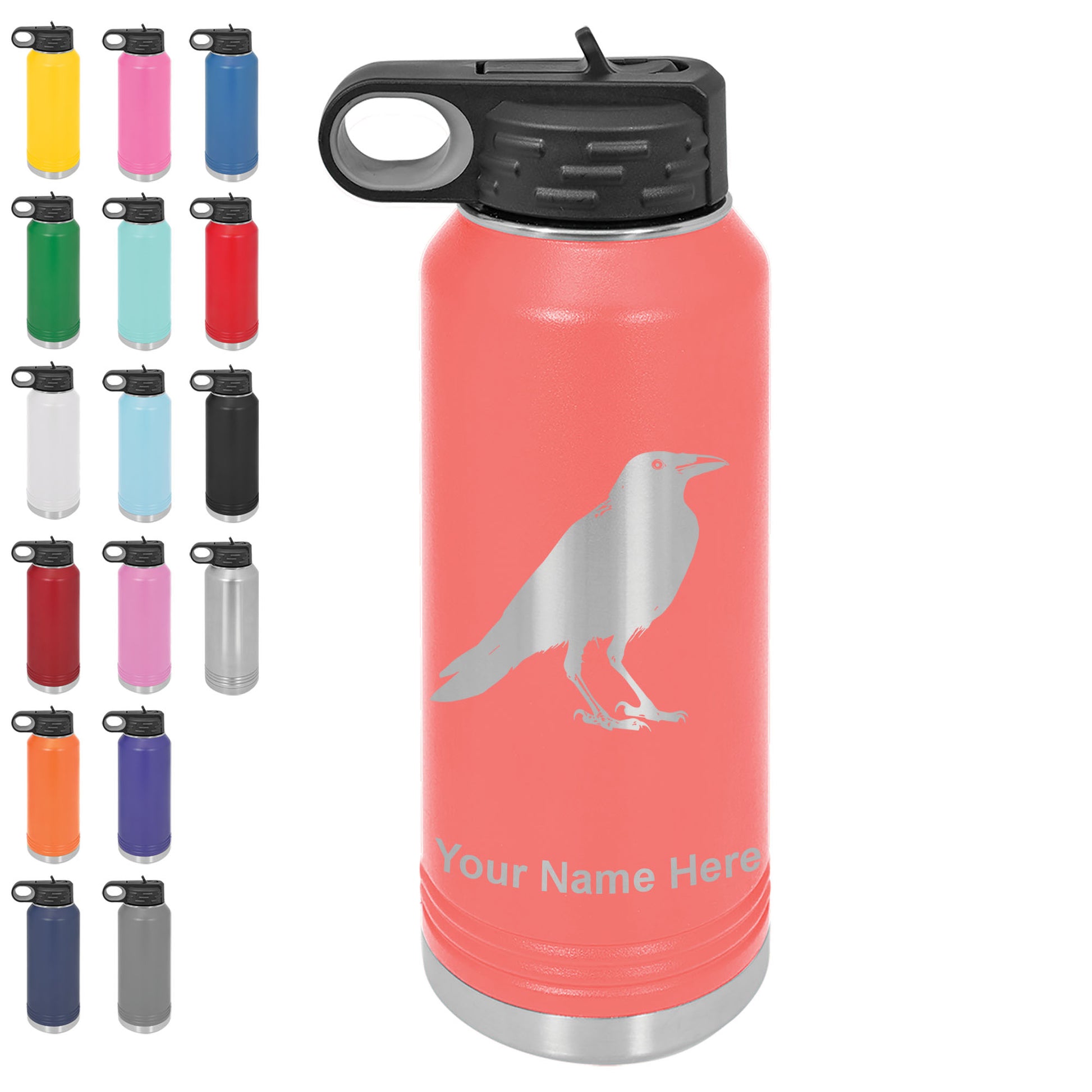 LaserGram 32oz Double Wall Flip Top Water Bottle with Straw, Crow, Personalized Engraving Included