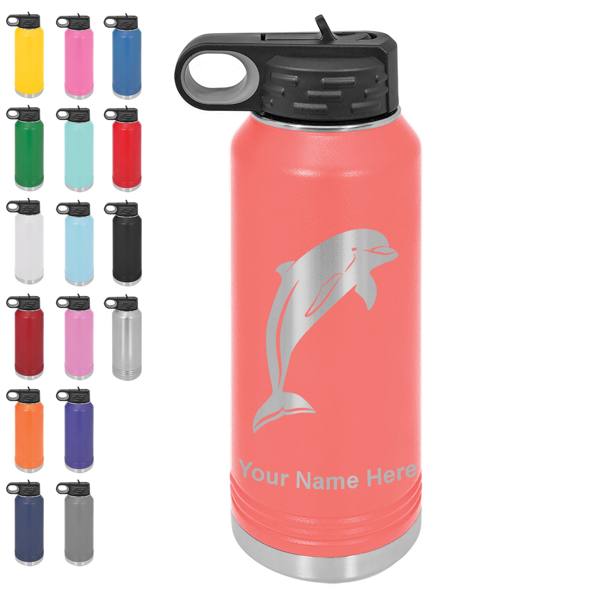 LaserGram 32oz Double Wall Flip Top Water Bottle with Straw, Dolphin, Personalized Engraving Included