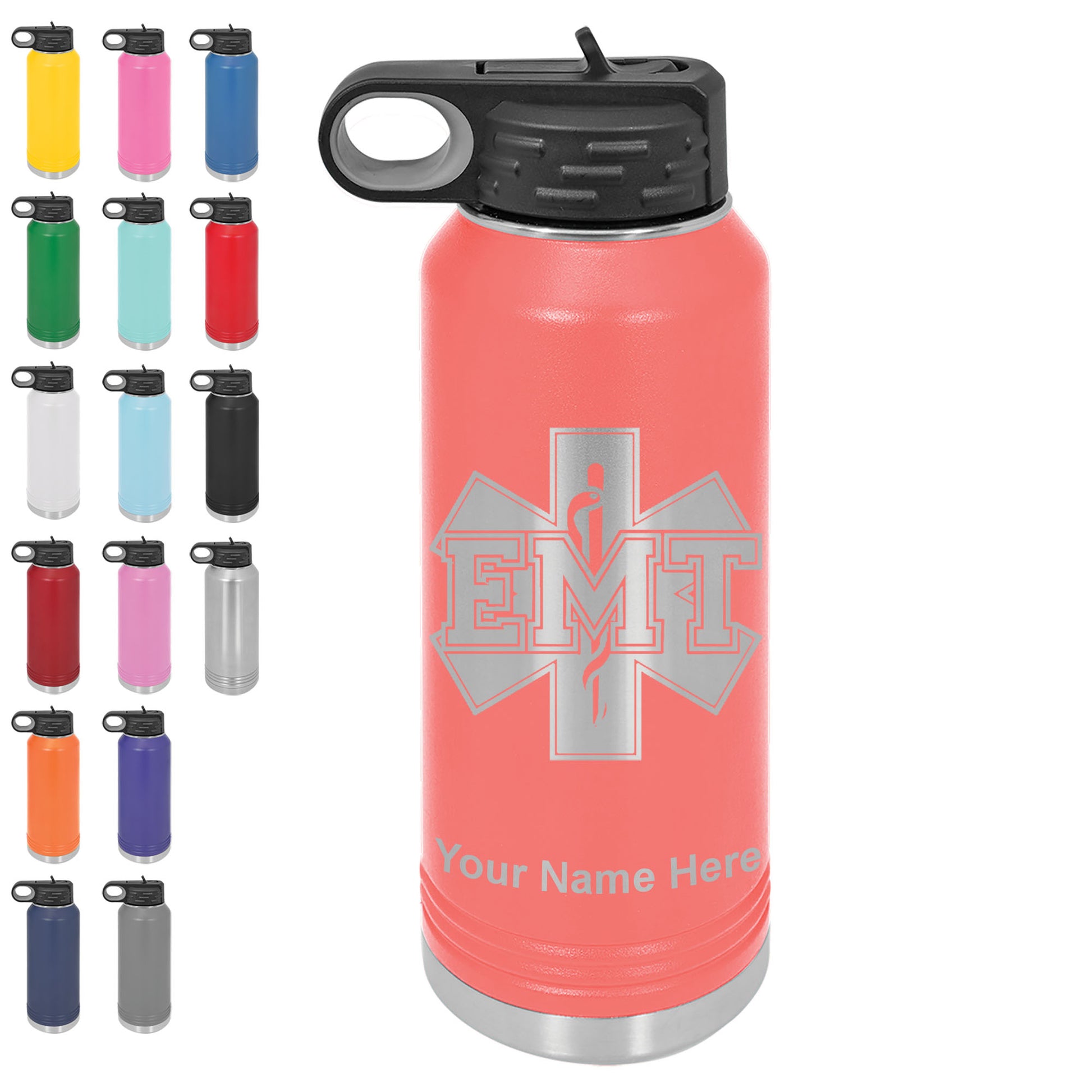LaserGram 32oz Double Wall Flip Top Water Bottle with Straw, EMT Emergency Medical Technician, Personalized Engraving Included