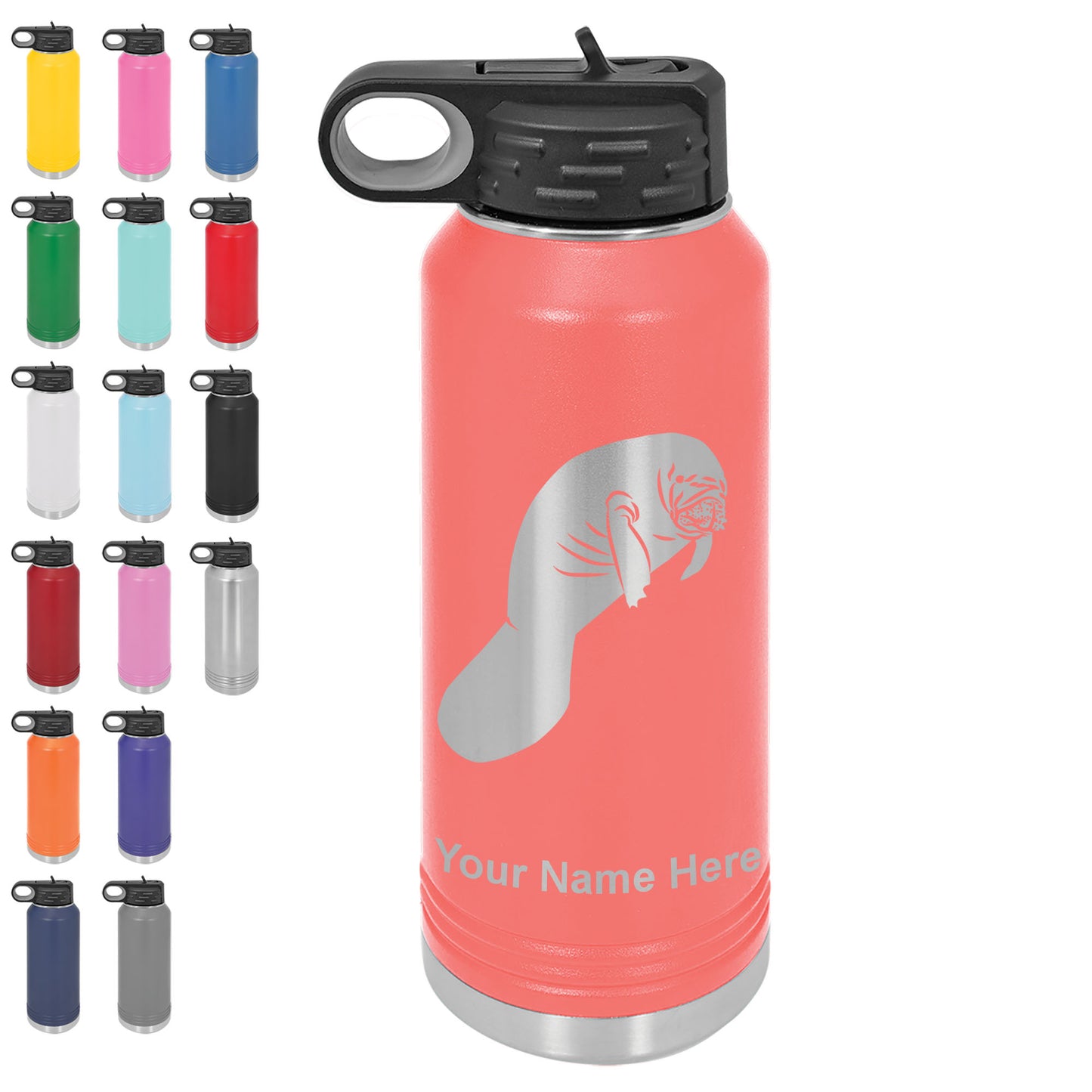LaserGram 32oz Double Wall Flip Top Water Bottle with Straw, Manatee, Personalized Engraving Included