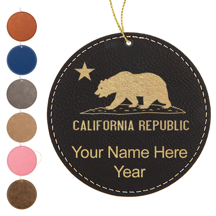 LaserGram Christmas Ornament, California Republic Bear Flag, Personalized Engraving Included (Faux Leather, Round Shape)
