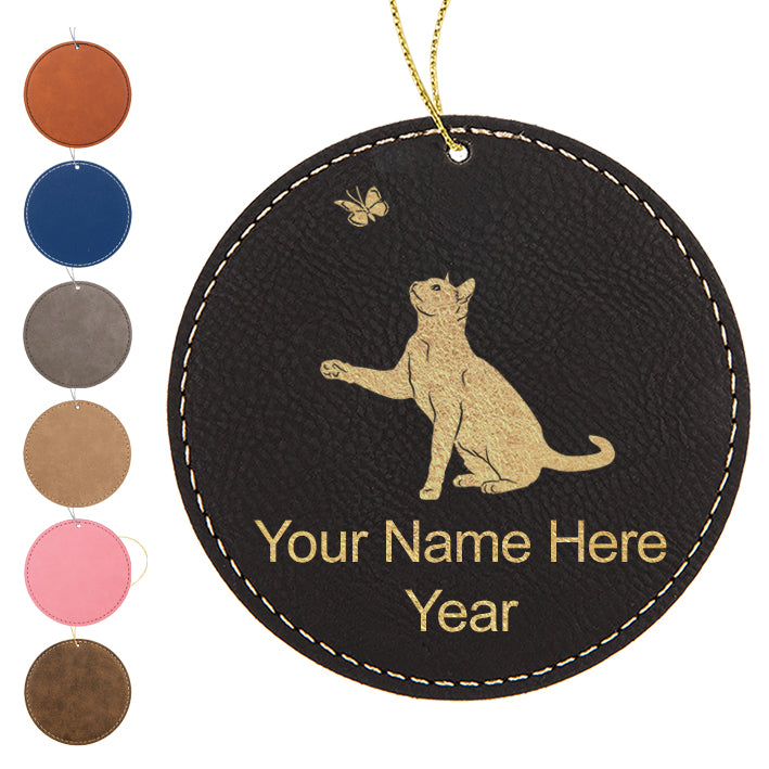 LaserGram Christmas Ornament, Cat with Butterfly, Personalized Engraving Included (Faux Leather, Round Shape)