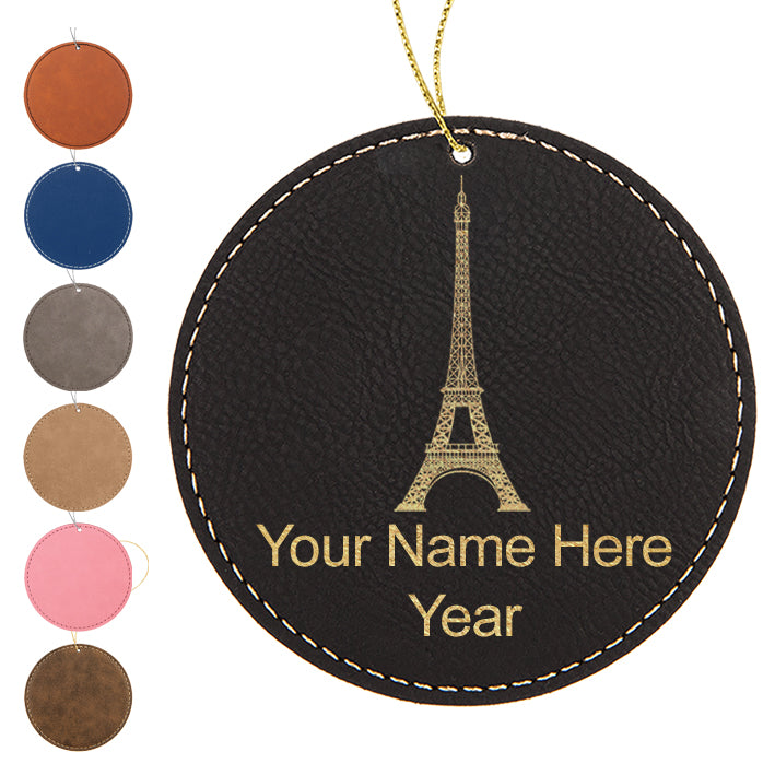 LaserGram Christmas Ornament, Eiffel Tower, Personalized Engraving Included (Faux Leather, Round Shape)
