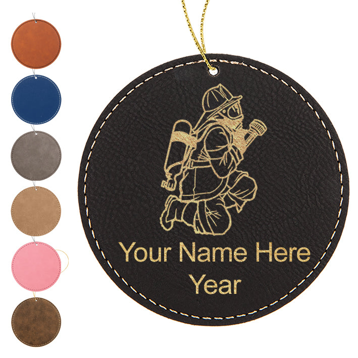 LaserGram Christmas Ornament, Fireman with Hose, Personalized Engraving Included (Faux Leather, Round Shape)