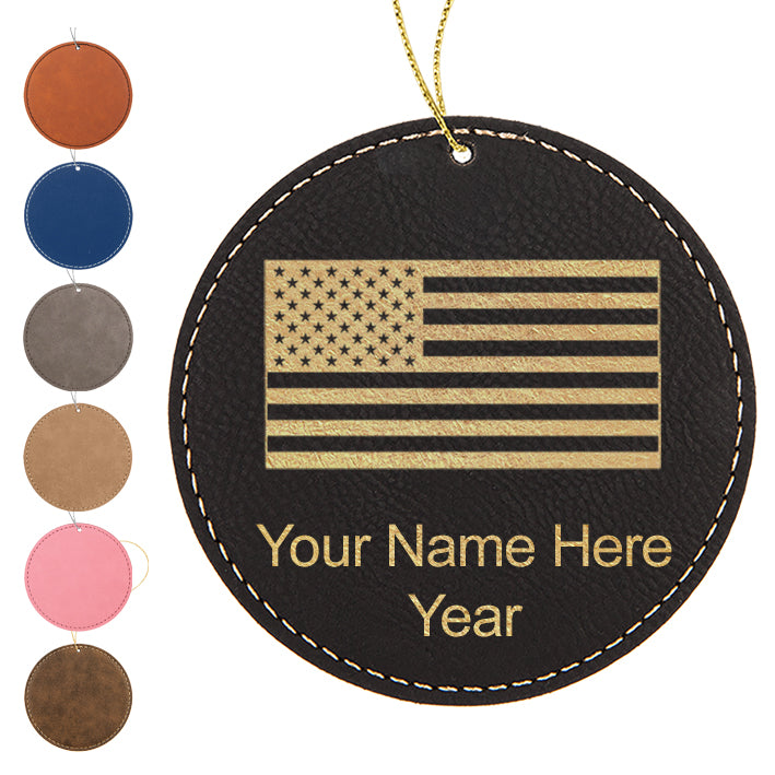 LaserGram Christmas Ornament, Flag of the United States, Personalized Engraving Included (Faux Leather, Round Shape)