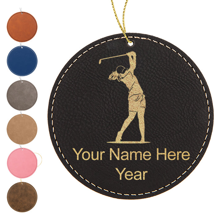 LaserGram Christmas Ornament, Golfer Woman, Personalized Engraving Included (Faux Leather, Round Shape)