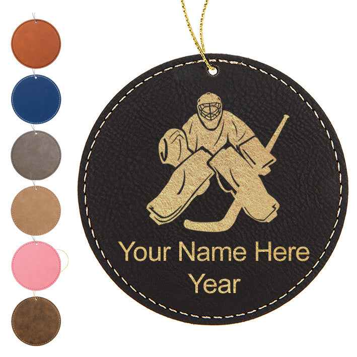 LaserGram Christmas Ornament, Hockey Goalie, Personalized Engraving Included (Faux Leather, Round Shape)