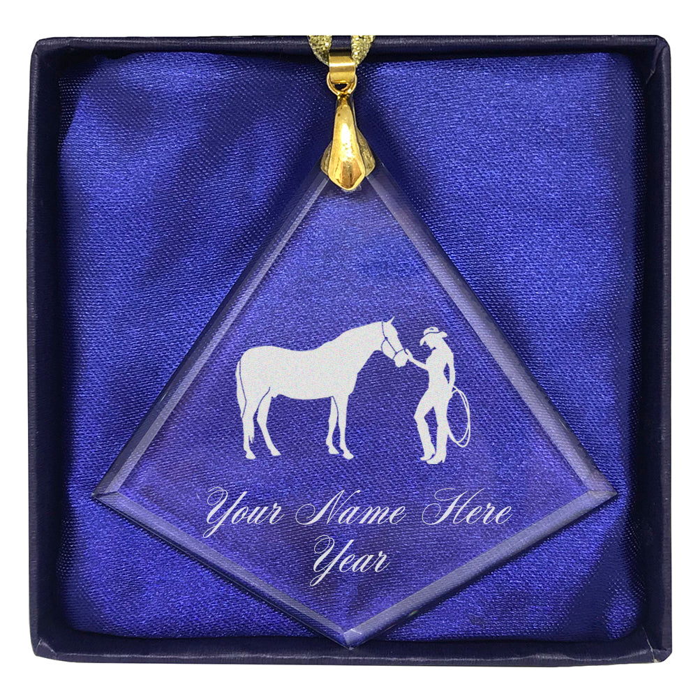 LaserGram Christmas Ornament, Horse and Cowgirl, Personalized Engraving Included (Diamond Shape)
