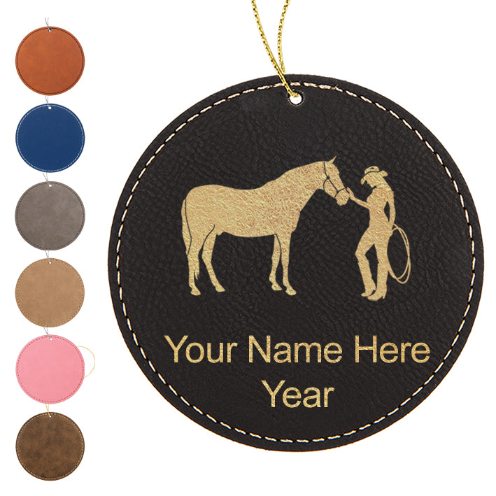 LaserGram Christmas Ornament, Horse and Cowgirl, Personalized Engraving Included (Faux Leather, Round Shape)