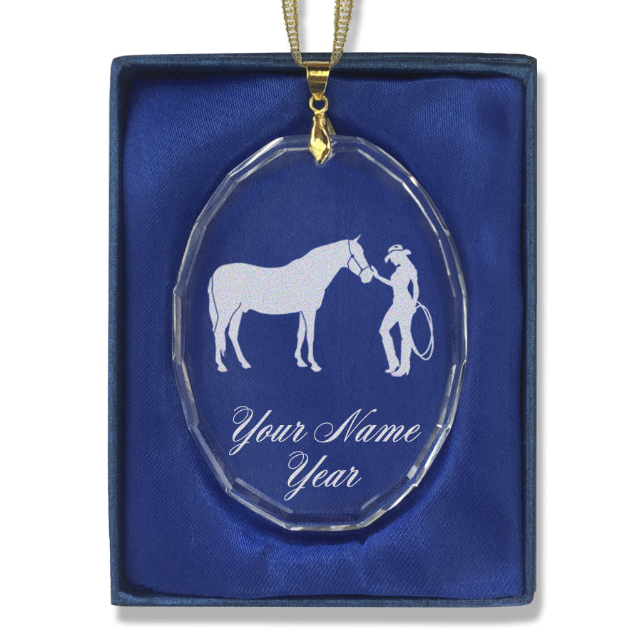 LaserGram Christmas Ornament, Horse and Cowgirl, Personalized Engraving Included (Oval Shape)