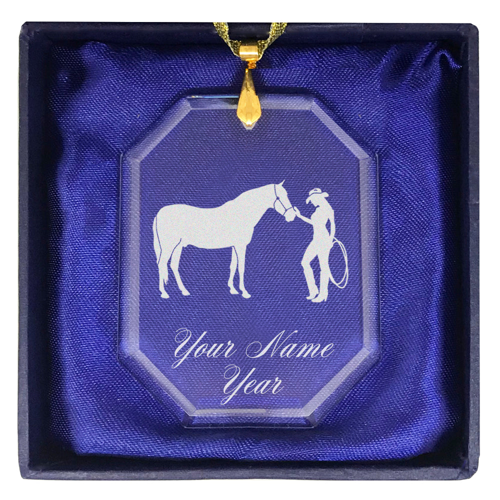LaserGram Christmas Ornament, Horse and Cowgirl, Personalized Engraving Included (Rectangle Shape)