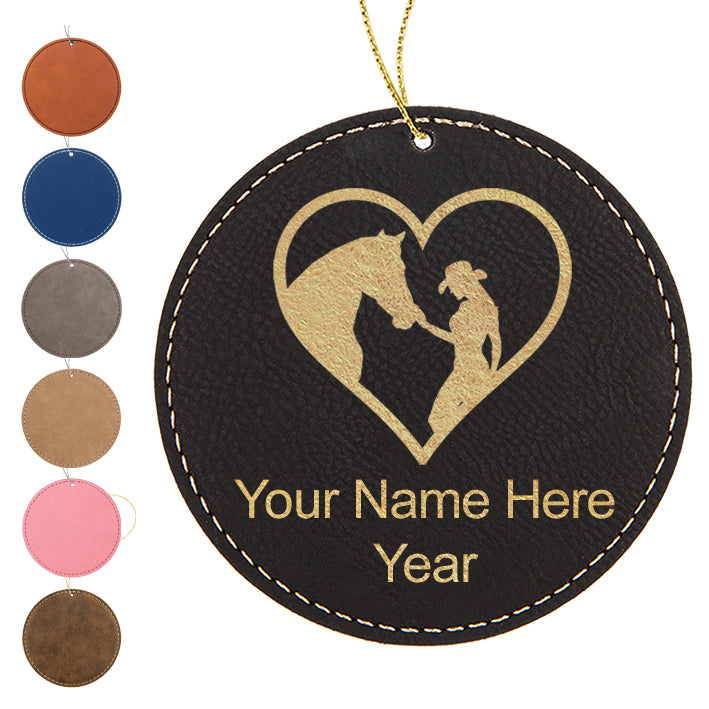 LaserGram Christmas Ornament, Horse Cowgirl Heart, Personalized Engraving Included (Faux Leather, Round Shape)