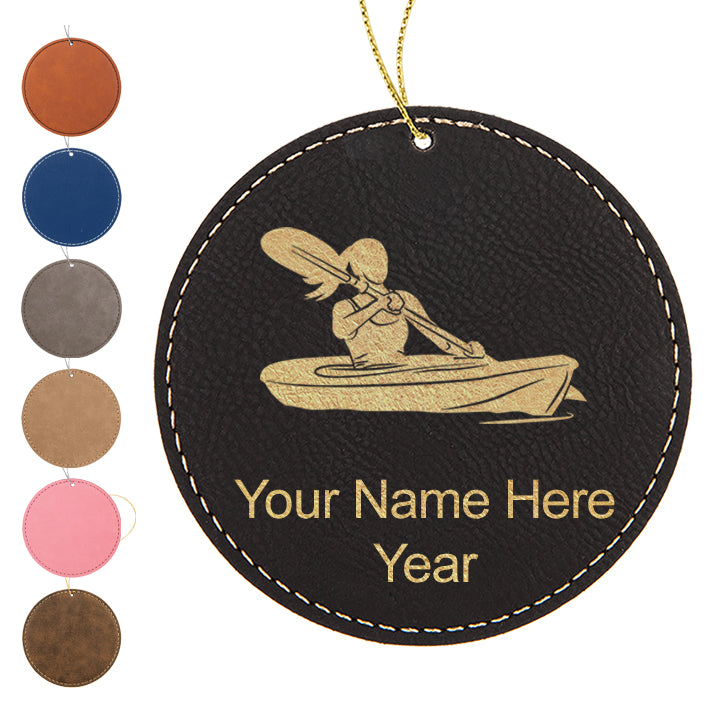 LaserGram Christmas Ornament, Kayak Woman, Personalized Engraving Included (Faux Leather, Round Shape)