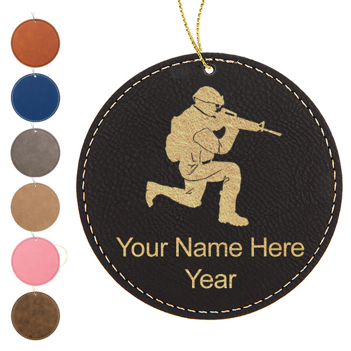 LaserGram Christmas Ornament, Military Soldier, Personalized Engraving Included (Faux Leather, Round Shape)