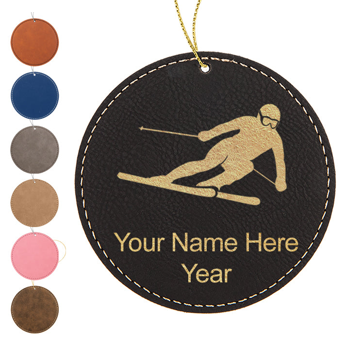 LaserGram Christmas Ornament, Skier Downhill, Personalized Engraving Included (Faux Leather, Round Shape)