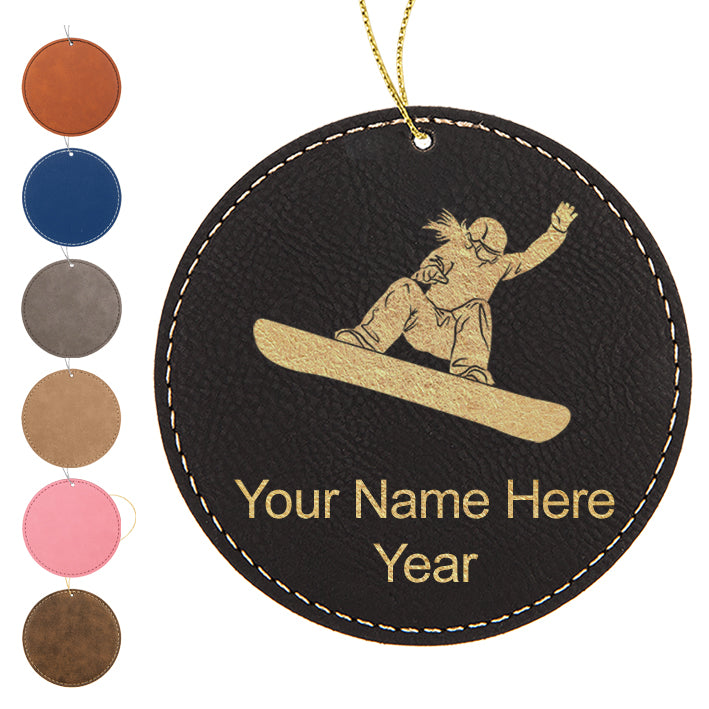 LaserGram Christmas Ornament, Snowboarder Woman, Personalized Engraving Included (Faux Leather, Round Shape)