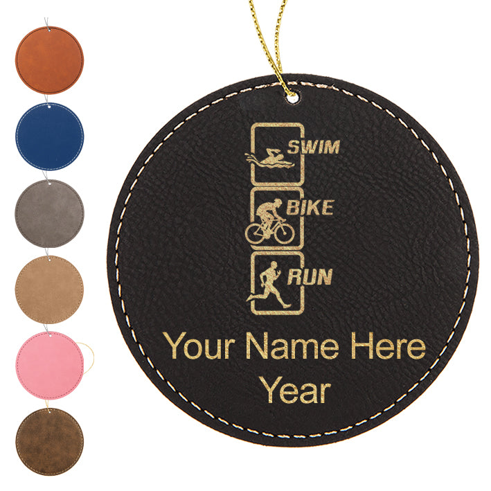 LaserGram Christmas Ornament, Swim Bike Run Vertical, Personalized Engraving Included (Faux Leather, Round Shape)