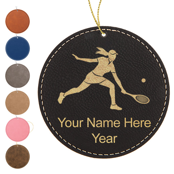 LaserGram Christmas Ornament, Tennis Player Woman, Personalized Engraving Included (Faux Leather, Round Shape)