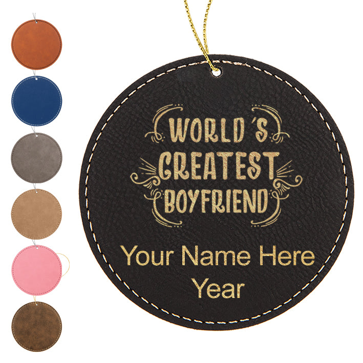 LaserGram Christmas Ornament, World's Greatest Boyfriend, Personalized Engraving Included (Faux Leather, Round Shape)