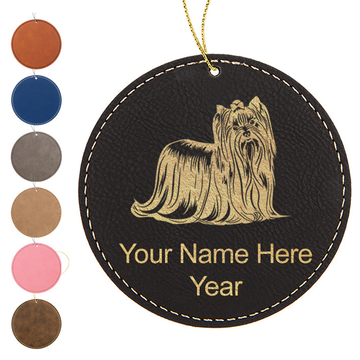 LaserGram Christmas Ornament, Yorkshire Terrier Dog, Personalized Engraving Included (Faux Leather, Round Shape)