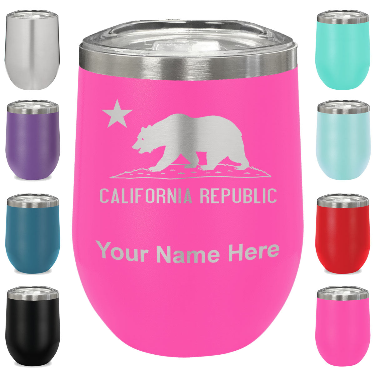 LaserGram Double Wall Stainless Steel Wine Glass, California Republic Bear Flag, Personalized Engraving Included