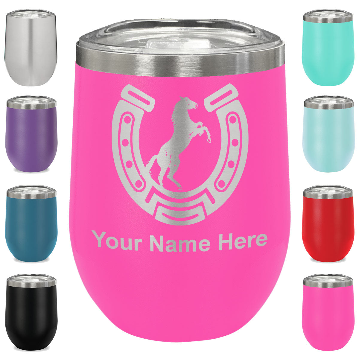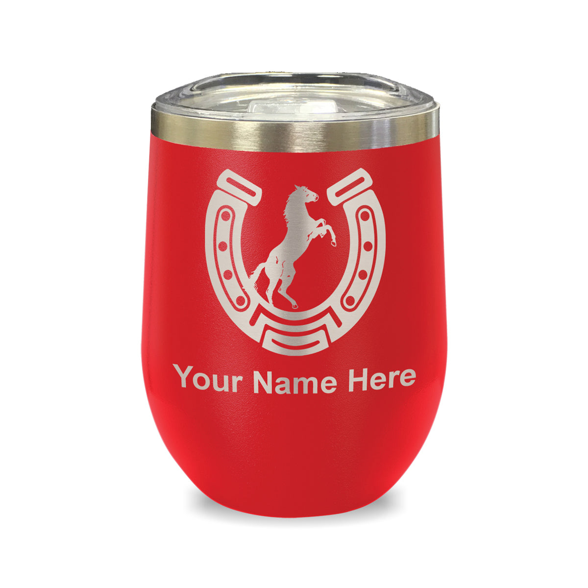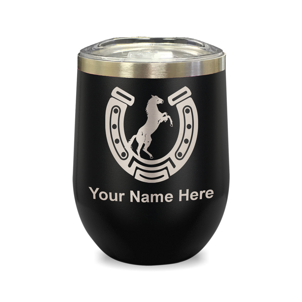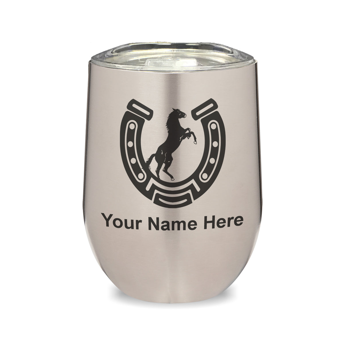 LaserGram Double Wall Stainless Steel Wine Glass, Horseshoe with Horse, Personalized Engraving Included