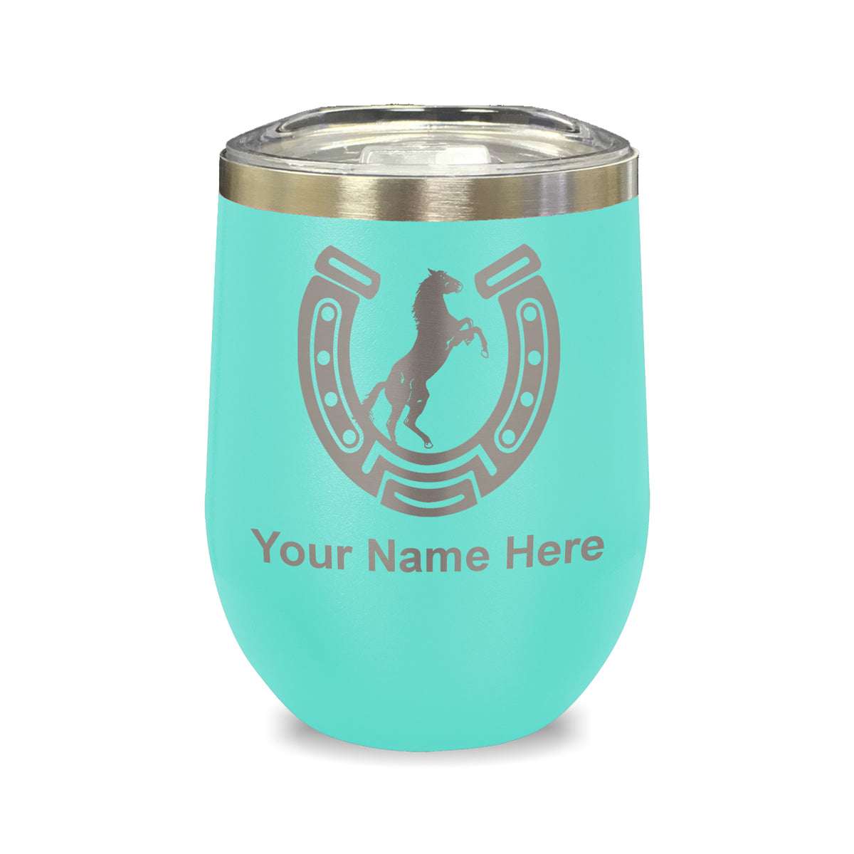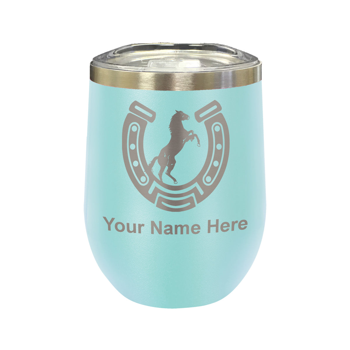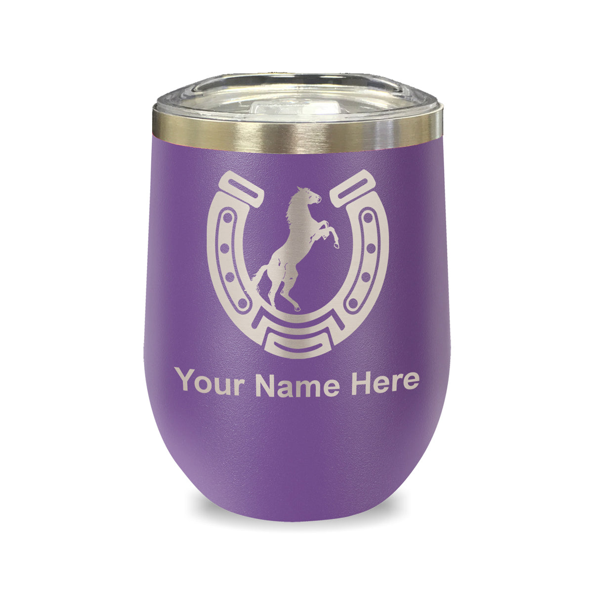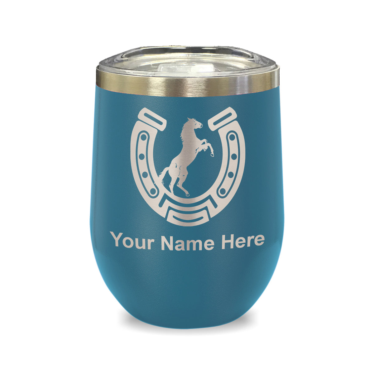 LaserGram Double Wall Stainless Steel Wine Glass, Horseshoe with Horse, Personalized Engraving Included