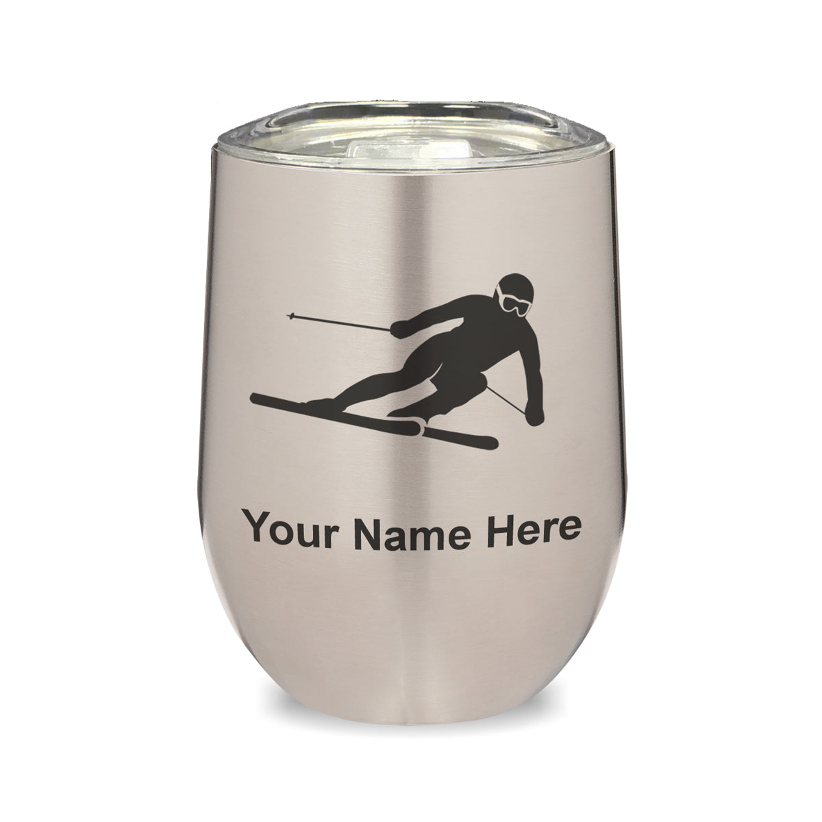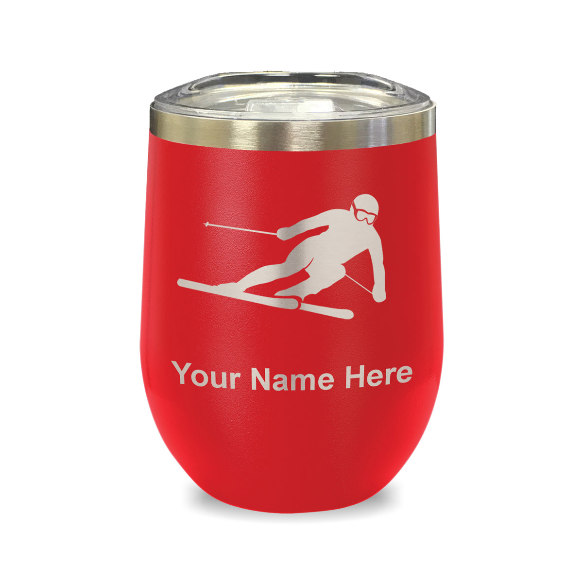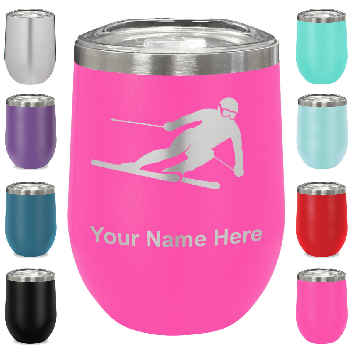 LaserGram Double Wall Stainless Steel Wine Glass, Skier Downhill, Personalized Engraving Included