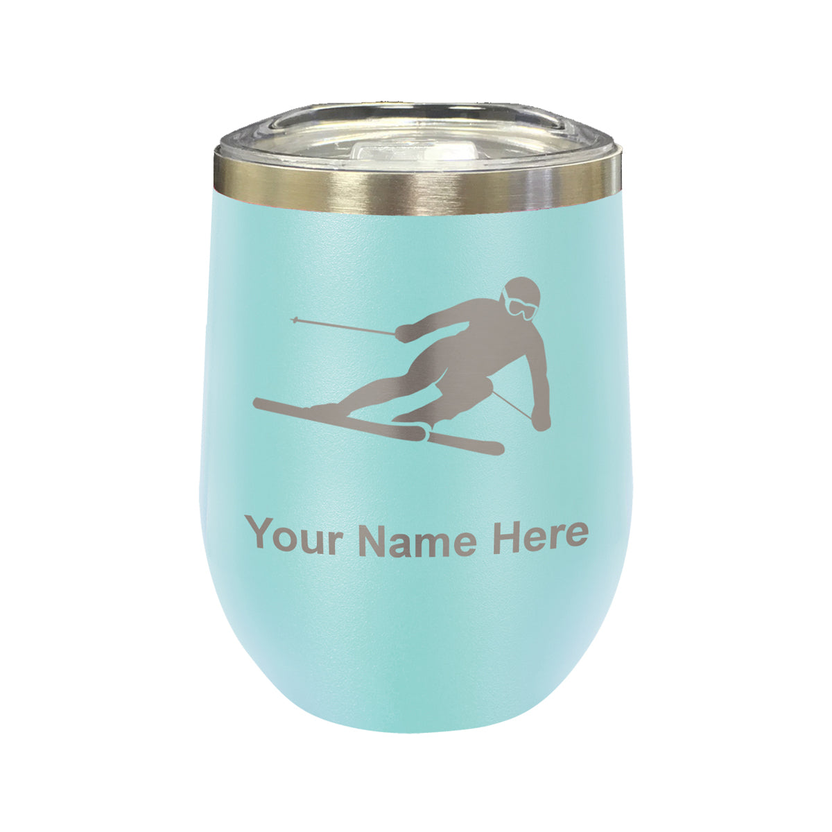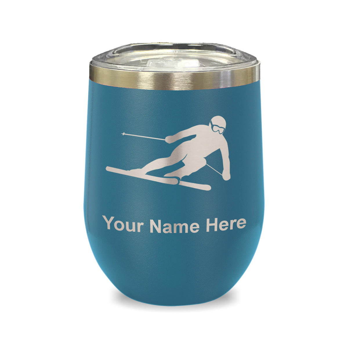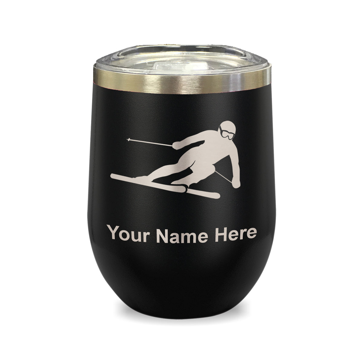 LaserGram Double Wall Stainless Steel Wine Glass, Skier Downhill, Personalized Engraving Included